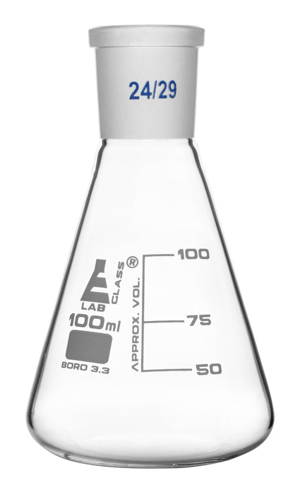Made of high-quality, heavy-duty 3.3 borosilicate glass, this conical flask features a narrow neck and a spill-preventing design. The interchangeable joint has a 24/29 socket size. With a 100ml capacity, the flask has white graduation lines marked every 25ml from 50ml to 100ml, making it perfect for any science or home laboratory. Note that no stopper is included. The flask stands 4.25" tall and has a base measuring 2.5" in diameter. Eisco Labs Borosilicate glass boasts the following heat tolerances: Strain Point -515°C, Annealing Point 565°C, and Softening Point 820°C.