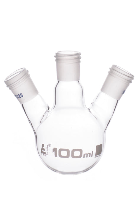 100ml capacity distillation flask with three necks. Made of high quality, heavy duty borosilicate glass. Interchangeable, screw thread joints. Socket size 19/26. Flask measures 4.5" tall, 2.5" width at the widest point.