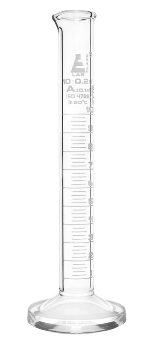 Here is the corrected text: 10ml graduated measuring cylinder made of high-quality, heavy-duty Borosilicate 3.3 glass. It features a spout for easy pouring and a round base for extra stability. The cylinder meets Class A tolerance, with an accuracy of ±0.10ml as per DIN EN ISO 4788 standard. The white printed graduations and specifications are clear and precise, with 0.2ml subdivisions. The cylinder stands 5.5" tall, with a base measuring 1.7" wide. The inner diameter of the cylinder body measures 13mm (0.6"), and the outer diameter measures 18mm (0.7"). This autoclavable cylinder boasts superior chemical durability and can withstand high temperatures and thermal shocks due to its low temperature gradient. Eisco Labs Borosilicate glass has the following heat tolerances: strain point, 515°C; annealing point, 565°C; and softening point, 820°C. The cylinder is calibrated to contain.