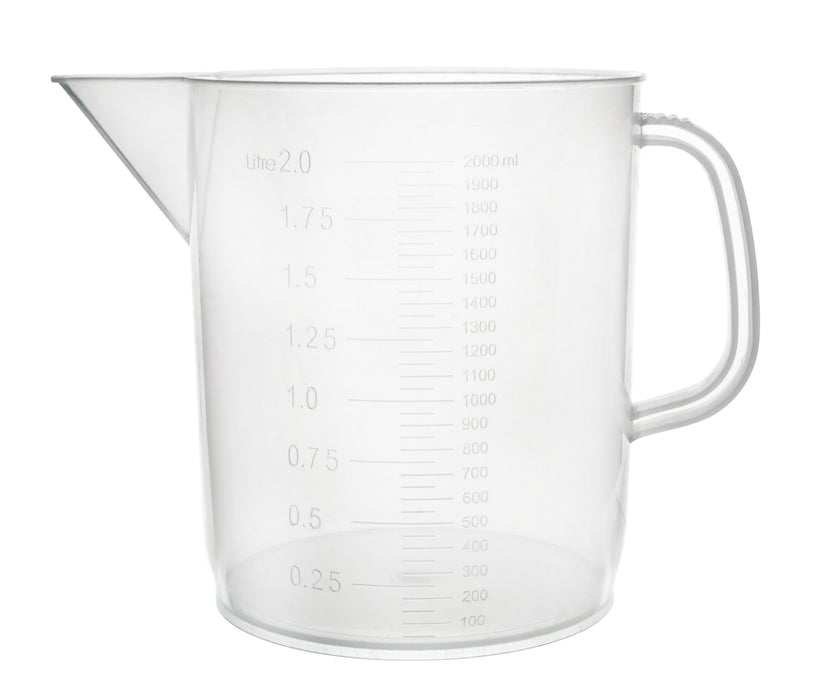 Here is the corrected text: This 2000ml measuring jug is made of premium-quality polypropylene plastic with a short, Euro-style design. It features industrial-quality durability, superior chemical resistance, and heat tolerance up to 135°C. The jug is autoclave, microwave, and dishwasher safe, with excellent resistance to strong acids, alcohols, and bases. The measuring jug is translucent, offering excellent optical clarity with raised 50ml graduations and specifications. It features a tapered spout for easy pouring and transferring of liquids, along with a handle for convenient lifting. Designed for professional laboratories, this jug is also an ideal choice for science classrooms and household use. The 2000ml capacity measuring jug measures 6.5" tall, 8.6" wide from spout to handle edge, and has a bottom diameter of 5".