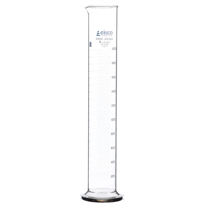 2000ml graduated measuring cylinder made of high quality, heavy duty Borosilicate 3.3 glass. Spout for easy pouring, and round base for extra stability. Class A tolerance, ±10.0ml as per DIN EN ISO 4788 standard. Blue printed graduations and specifications. 20ml subdivisions. Cylinder stands 22.25" tall, with a base measuring 4.6" wide. Inner diameter of cylinder body measures 75mm (2.9"), and outer diameter measures 89mm (3.5"). Autoclavable, with superior chemical durability. Low temperature gradient- can withstand high temperatures & thermal shocks. Eisco Labs Borosilicate glass has the following heat tolerances: Strain Point -515°C | Annealing Point 565°C | Softening Point 820°C. Calibrated to contain.