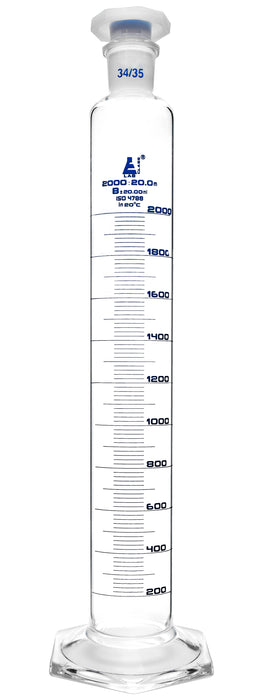 2000ml capacity measuring cylinder made of high quality, heavy duty Borosilicate 3.3 glass. Includes an interchangeable, 34/35 polypropylene stopper. Hexagonal base for extra stability. Class B tolerance, ±20.00ml as per ISO/ASTM.Cylinder stands 24.5" tall, with a base measuring 5" wide. Body outer diameter measures 3.3".Autoclavable, with superior chemical durability. Low temperature gradient- can withstand high temperatures & thermal shocks. Eisco Labs Borosilicate glass has the following heat tolerances: Strain Point -515°C | Annealing Point 565°C | Softening Point 820°C.