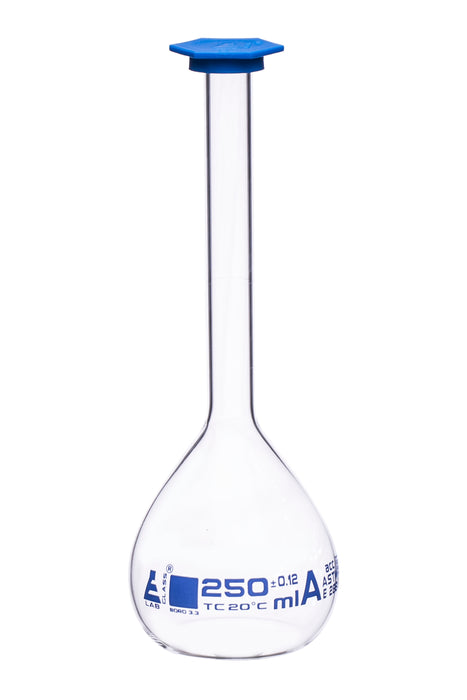 CLASS-A Capacity 250ml Tolerance ± 0.120ml Borosilicate glass with blue, graduation mark. Flask measures 9" tall, bottom diameter measures 3", top diameter measures 0.5". Fitted with snap cap. Class A, as per ASTM-E288.