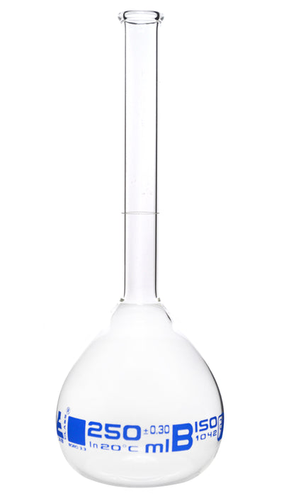 This volumetric flask is made of high-quality, heavy-duty 3.3 Borosilicate glass and features a rimmed neck and Class B tolerance. It has a 250ml capacity and meets the DIN ISO 1042 standard. The flask stands 8.5 inches tall with a width of 3 inches at its widest point, and it has a socket size of 19/26.