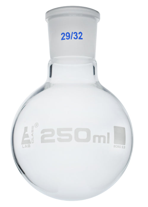 Here is the corrected text: Made of high-quality, heavy-duty borosilicate glass, this 250ml capacity boiling flask is perfect for any science or home laboratory. It features a single, interchangeable joint with a 29/32 size socket. Note that no stopper is included. The flask stands 5 inches tall, with a neck measuring 1.3 inches wide and a bottom diameter of 3.75 inches. Eisco Labs borosilicate glass has the following heat tolerances: strain point -515°C, annealing point 565°C, and softening point 820°C.