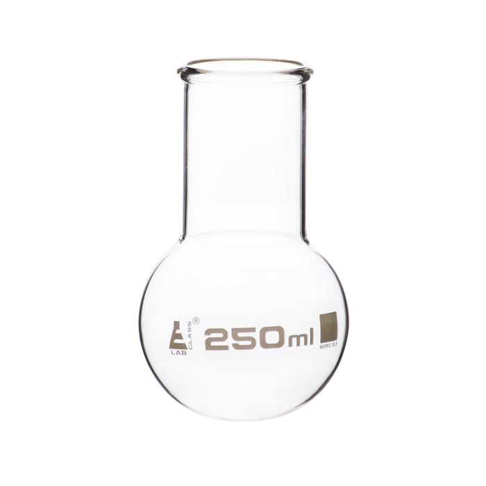 250ml Round bottom wide neck boiling flask made of high quality Borosilicate 3.3 glass. Inside diameter of wide mouth is 1 -13/16" ( 46.04mm) . Diameter of flask is approx. 3" (76.2mm). Thick Beaded Rim. Clamp Not included - Used for holding imaging purposes. This clamp can be purchased by searching PRCMP08BH.Autoclavable, with superior chemical durability. Low temperature gradient- can withstand high temperatures & thermal shocks. Eisco Labs Borosilicate glass has the following heat tolerances: Strain Point -515°C | Annealing Point 565°C | Softening Point 820°C.Eisco Labs proudly manufactures its own products using state-of-the-art equipment, and following the highest standards of quality control.Each product is carefully designed by a team of laboratory professionals and experienced engineers with quality and durability in mind. They are manufactured with only the highest grade, raw materials and according to international quality standards to ensure that they can withstand use in even the toughest laboratory environments.