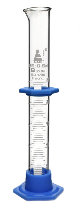 25ml Measuring Cylinder with spout, made of high quality borosilicate glass, marked with white graduation lines. Class B. As per DIN EN ISO 4788 standard. Tolerance ± 0.05ml Stands 6.75" tall, and has a diameter of 0.75". The base measures 1.6" wide and long. This cylinder has a detachable hexagonal base and protective collar. Spout for easy pouring. 0.5ml graduation lines, marked every 5ml. Eisco Labs Borosilicate glass has the following heat tolerances: Strain Point -515°C | Annealing Point 565°C | Softening Point 820°C.