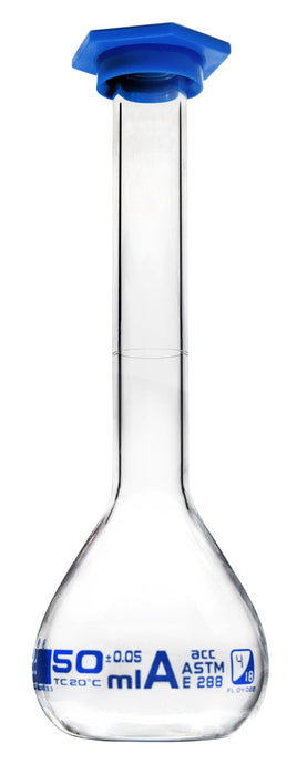 CLASS-A Capacity 50ml Tolerance ± 0.050ml Borosilicate glass with blue, graduation mark. Flask measures 5.75" tall, bottom diameter measures 1.75", top diameter measures 0.5". Fitted with snap cap. Class A, as per ASTM-E288.