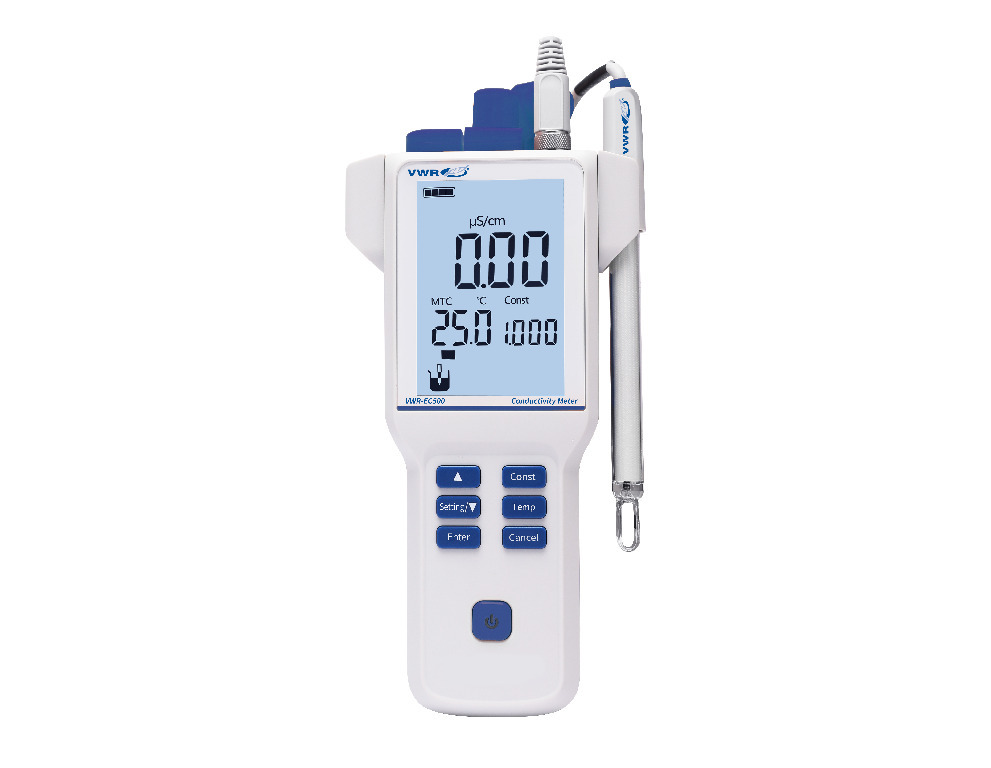 The VWR-EC500 meter provides accurate and reliable measurements of conductivity, TDS, and temperature in any environment. The easy-to-use VWR-EC500 portable meters provide accurate measurements inside and outside the lab with their rechargeable battery. The large, backlit LCD display allows results to be easily viewed during operation. Features: • High-resolution LCD display (3.5") • One-point calibration with standard recognition • IP65 waterproof • Automatic or manual temperature compensation capabilities • Auto-read and continuous-read measurement options • Ability to save 200 data sets for each parameter • Rechargeable battery • Displays electrode status (electrode slope) Delivery: All meters include electrode holders (2), meter silicone rubber case, and hand strap. Ordering Information: Carrying case available for purchase separately (77618-810). Three-year meter warranty. For application-specific recommendations, please reference the "VWR Electrode Selection Guide" located in the Related Information section. Available Configurations: • VWR-EC500 meter with EC03 conductivity electrode k=10 and conductivity standard 1413 µS/cm 50 ml bottle, Cat. No.: 77618-954 • VWR-EC500 meter, no electrode, Cat. No.: 77618-948 • VWR-EC500 meter with EC01 conductivity electrode k=1 and conductivity standard 1413 µS/cm, 50 ml bottle, Cat. No.: 77618-950 • VWR-EC500 meter with EC02 conductivity electrode k=0.1 and conductivity standard 1413 µS/cm 50 ml bottle, Cat. No.: 77618-952
