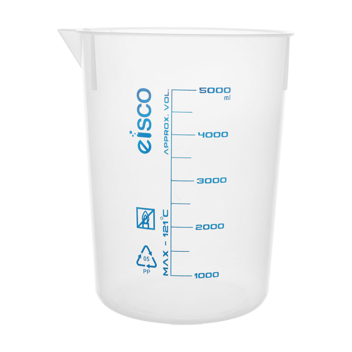 5000ml measuring beaker made of high quality, heavy duty polypropylene. Short form. Beaker features a non-drip spout. Transparent, with easy to read screen printed graduations and specifications. Autoclavable & microwavable with superior chemical durability.Eisco Labs proudly manufactures its own products using state-of-the-art equipment, and following the highest standards of quality control.Each product is carefully designed by a team of laboratory professionals and experienced engineers with quality and durability in mind. They are manufactured with only the highest grade, raw materials and according to international quality standards to ensure that they can withstand use in even the toughest laboratory environments.