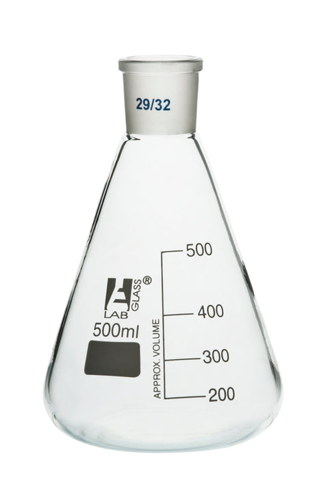 Here is the corrected text: This conical flask is made of high-quality borosilicate glass and features a spill-preventing design with a narrow neck. The flask has an interchangeable joint with a 29/32 socket size and a capacity of 500ml. The white graduation lines are marked every 100ml from 200ml to 500ml, making it perfect for any science or home laboratory. Note that no stopper is included. The flask stands 6.5 inches tall and has a base measuring 4.2 inches in diameter.