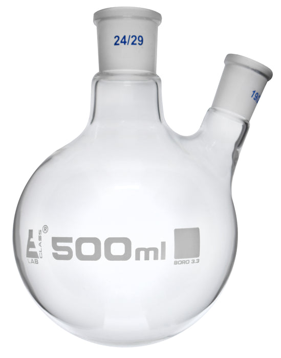500ml capacity, round bottom distilling flask made of high quality, heavy duty 3.3 borosilicate glass. Oblique neck with 24/29 socket size joint, and side socket size 19/26. No stoppers included. Flask stands 6" tall, and base measures 4" in diameter. Total width of flask is 4.2". Eisco Labs Borosilicate glass has the following heat tolerances: Strain Point -515°C | Annealing Point 565°C | Softening Point 820°C.