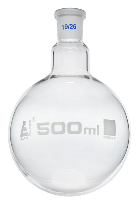 500ml capacity boiling flask made of high quality, heavy duty borosilicate glass. Single, interchangable joint with 19/26 size socket. No stopper included. Flask measures 6.5" tall, and has a neck measuring 1.3" wide, and a bottom diameter measuring 4.5".