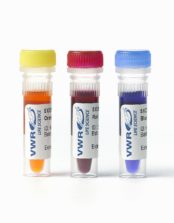 VWR® loading buffers, with three different dyes and migration fronts, make it easy to select the right loading buffer for your specific task., VWR® loading buffers are formulated as 5x solutions containing Ficoll, Tris-buffer, EDTA and either Cresol Red, Bromophenol Blue or Orange G as tracking dye. DNA loading buffers are used for loading DNA samples onto DNA gels for gel electrophoresis. DNA loading buffers contain a coloured dye and a density agent. The density agent serves to enhance the density of the DNA sample allowing the DNA to sink into the bottom of the well. The dye adds visibility to the DNA sample and also serves as a tracking dye allowing the user to monitor the DNA migration during electrophoresis. For long term storage, keep the loading buffer at -20 °C., 02_BulletPoint: Ready-to-use buffers | 5x formulation | Three different tracking dyes available, 13_Caution: For Research Use Only. Not for use in diagnostic procedures., 5X Loading Buffer Red, Cat. No.: 76620-550, Volume: 5× 1 ml, Grade/Usage: Staining | Dye & Stain | Molecular biology stain | Dye (loading) | Electrophoresis | Molecular biology, VWR® loading buffers, with three different dyes and migration fronts, make it easy to select the right loading buffer for your specific task., VWR® loading buffers are formulated as 5x solutions containing Ficoll, Tris-buffer, EDTA and either Cresol Red, Bromophenol Blue or Orange G as tracking dye. DNA loading buffers are used for loading DNA samples onto DNA gels for gel electrophoresis. DNA loading buffers contain a coloured dye and a density agent. The density agent serves to enhance the density of the DNA sample allowing the DNA to sink into the bottom of the well. The dye adds visibility to the DNA sample and also serves as a tracking dye allowing the user to monitor the DNA migration during electrophoresis. For long term storage, keep the loading buffer at -20 °C., 02_BulletPoint: Ready-to-use buffers | 5x formulation | Three different tracking dyes available, 13_Caution: For Research Use Only. Not for use in diagnostic procedures., VWR® loading buffers, with three different dyes and migration fronts, make it easy to select the right loading buffer for your specific task., VWR® loading buffers are formulated as 5x solutions containing Ficoll, Tris-buffer, EDTA and either Cresol Red, Bromophenol Blue or Orange G as tracking dye. DNA loading buffers are used for loading DNA samples onto DNA gels for gel electrophoresis. DNA loading buffers contain a coloured dye and a density agent. The density agent serves to enhance the density of the DNA sample allowing the DNA to sink into the bottom of the well. The dye adds visibility to the DNA sample and also serves as a tracking dye allowing the user to monitor the DNA migration during electrophoresis. For long term storage, keep the loading buffer at -20 °C., 02_BulletPoint: Ready-to-use buffers | 5x formulation | Three different tracking dyes available, 13_Caution: For Research Use Only. Not for use in diagnostic procedures., 5X Loading Buffer Orange, Cat. No.: 76620-554, Volume: 5× 1 ml, VWR® loading buffers, with three different dyes and migration fronts, make it easy to select the right loading buffer for your specific task., VWR® loading buffers are formulated as 5x solutions containing Ficoll, Tris-buffer, EDTA and either Cresol Red, Bromophenol Blue or Orange G as tracking dye. DNA loading buffers are used for loading DNA samples onto DNA gels for gel electrophoresis. DNA loading buffers contain a coloured dye and a density agent. The density agent serves to enhance the density of the DNA sample allowing the DNA to sink into the bottom of the well. The dye adds visibility to the DNA sample and also serves as a tracking dye allowing the user to monitor the DNA migration during electrophoresis. For long term storage, keep the loading buffer at -20 °C., 02_BulletPoint: Ready-to-use buffers | 5x formulation | Three different tracking dyes available, 13_Caution: For Research Use Only. Not for use in diagnostic procedures., 5X Loading Buffer Blue, Cat. No.: 76620-552, Volume: 5× 1 ml