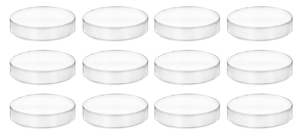 Pack of 12 petri dishes with lids made of high quality, translucent polypropylene plastic. Each dish measures 3.75" (95mm) in diameter and 0.5" (13mm) deep. Lids measure 3.9" (100mm) in diameter. Unbreakable, non-toxic, non-sterile, multifunctional and ready to use. Excellent for general laboratory applications, including cell culturing, plant germination, precipitate drying and solvent evaporation, home or classroom science experiments, crafting, small storage solutions and more. Petri dishes are reusable and simple to clean. Top rack dishwasher safe.