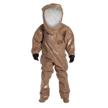 Tychem® RESPONDER® CSM combines multiple film barriers laminated to both sides of a high-strength polypropylene substrate for high level protection against toxic and corrosive chemicals. It is effective for handling chemical warfare agents as well as military site cleanup and HazMat first response. Tychem® RESPONDER® CSM fabric provides at least 30 minutes of protection against 320 chemical challenges. Each suit undergoes rigorous inspection and each Level A suit, pressure testing. Each fabric lot is tested using live toxic agents plus one garment for each test fabric production run is also tested for seam barrier with live toxic agents. Desert tan color for low visibility applications.Encapsulated Level A garment design is our highest level of protection from liquid splash and vapor/gas exposures for both the wearer and respiratory equipmentDouble taped seams provide strong chemical resistance against heavy liquid splashes. A sewn seam is covered, both inside and outside of garment with compatible chemical-resistant material by heat-sealing.Standard width, three layer (PVC 40 mil/Teflon® 5 mil/PVC 20 mil) faceshieldFront entry design allows wearer to partially don garment (maintain standby position) without assistanceExpanded back to accommodate self-contained air breathing apparatus (SCBA)Vapor tight zipper. Extra long to increase garment opening and aid donning and doffingStorm flap covers zipper which can be secured by the wearer with rugged hook and loop material to prevent intrusion at zipperIntegrated socks composed of garment materialAttached flaps are designed to cover boot tops to help reduce potential for liquid intrusionTwo exhaust valves release higher pressure inside encapsulating garments while simultaneously helping to prevent inward leakage of external vapors or particles into the garment. One-way valves are positive pressure and open on demand. Valves include splash covers made of barrier material to help prevent liquid intrusion. Valves are located on left back of head and right lower back.Each suit has a unique serial number and is fully tested at time of manufacture including positive air pressure integrity testing per ASTM F1052.Pass-thrus are optional and can be installed upon request when ordering. Some suits are available with optional pass-thrus to accommodate the following SCBA manufacturers: Scott, Interspiro, MSA, Draeger, Survivair®. Please call Customer Service for additional information.Made in the USA, North American Free Trade Agreement (NAFTA) compliant and Trade Agreement Act (TAA) compliantTychem® RESPONDER® CSM Encapsulated Level A Suit. Expanded Back, Front Entry. Standard Visor, 3 Layers: 40 mil PVC / 5 mil Teflon® / 20 mil PVC. Attached Butyl (mil. spec.) Gloves. Attached Socks with Outer Boot Flaps. Double Storm Flap with Hook & Loop Closure. Two Exhaust Valves. Double Taped Seams. Tan.
