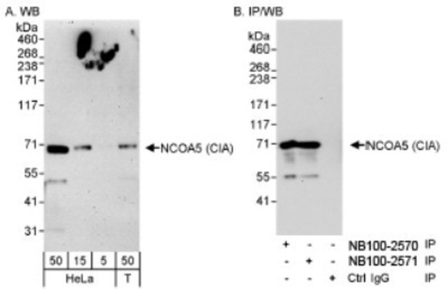 NCOA5 Polyclonal specifically detects NCOA5 in Human samples. It is validated for Western Blot, Immunohistochemistry, Immunoprecipitation.