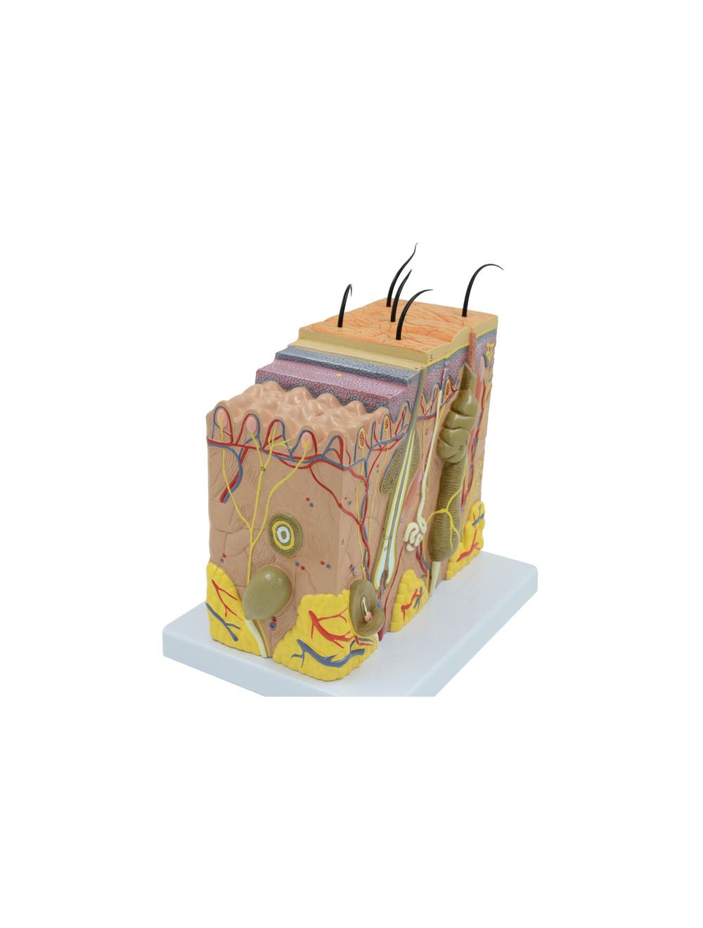 This cross-sectional view of the human skin, enlarged 70 times, gives a close-up and 3-dimensional view. It shows three layers and a detailed view of the sweat gland, fatty tissue, and hair follicle. A color key is included identifying 17 parts of the skin. Model is made from PVC plastic. Includes detailed key card.