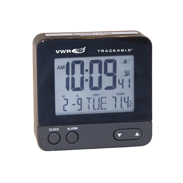 Radio-Controlled Atomic Clocks are extremely accurate to 1/10000 of a second. They automatically adjust for AM/PM, 24-hour time, day/date, and daylight saving time via radio signal. These clocks are ideal for recording the receipt of samples, noting the exact time an event occurred, supporting documentation, providing a standard for a location's other clocks, maintaining ISO 9000 certification, and for numerous occasions when knowing the exact time is immensely valuable. Each Traceable Product comes with an individually numbered Traceable Certificate, ensuring accuracy from an ISO/IEC 17025:2017(1750.01) calibration laboratory accredited by A2LA. This certificate indicates traceability of measurements to the SI units through NIST or other recognized national measurement institutes (NMI) that are signatories to the CIPM Mutual Recognition Agreement. Each product undergoes an intense vetting process before it can carry the Traceable name, saving time and money by eliminating the need for separate calibration. The clock features a temperature range of 23 to 122 °F (-5 to 50 °C) with a resolution of 0.1 °C. The clear display with an elegant acrylic lens shows a resolution of 1 second, displaying time, calendar, and weekday. It also reads indoor temperature (°C/°F), offers an alarm and snooze function, and features an amber LED backlight for daytime use and an auto-night light function for night viewing. A NIST-traceable calibration certificate with data is included. The Mini Bench-Top Atomic Clock requires two AAA batteries for operation, while the standard Bench-Top Atomic Clock requires two AA batteries. The VWR Traceable mini bench-top atomic clock has a 1-second resolution and measures 6.35 × 6.35 × 2.5 cm (2.5 × 2.5 × 1"). The VWR Traceable bench-top atomic clock also has a 1-second resolution and measures 10.16 × 7.62 × 3.175 cm (4 × 3 × 1¼").