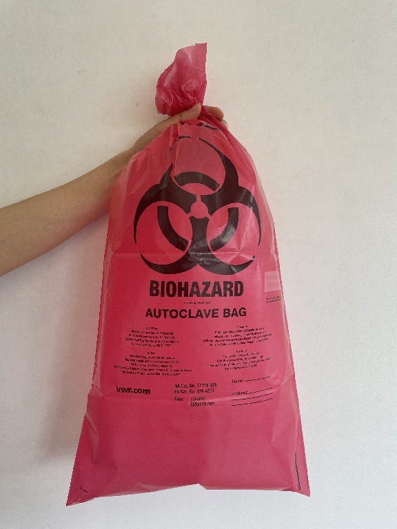Highly resistant to tears and punctures |, 08_Certifications: | ISO 9001:2015, Sedex. |, Capacity: 45 L, Color: Red, Biohazard printed bag, with temperature indicator, Dimensions: 635×900 mm (25×35"), Material: PP, Thickness: 50 µm/2 mil, | Sturdy, temperature-resistant bags are ideal for disposal of non-hazardous waste that must first be autoclaved. Bags can also be used for autoclaving other products. |, Bags are supplied complete with 20 cm twist tie wire closures that allow expansion of the bag and ventilation when cooling. Bags meet the requirements of the 165 g puncture inspection standard as described in ASTM D1709. |, 02_BulletPoint: | Autoclavable up to 135 ℃ (275 ℉) maximum |
