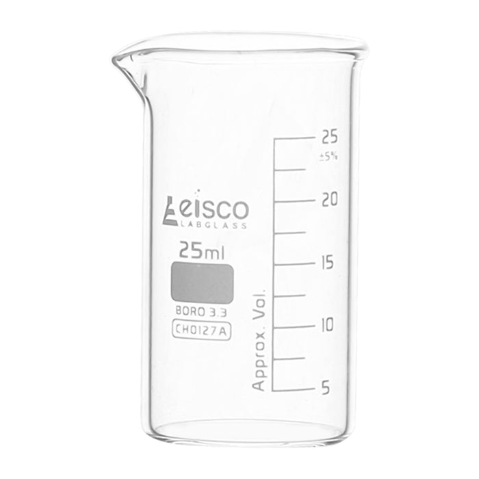 25ml capacity, tall form beaker made of Borosilicate 3.3 Glass. Graduations marked every 2.5ml. Spout for easy pouring. Uniform walls provide excellent strength against breakage.Beaker stands 2.2" tall, and has an inner diameter of 28.8mm and an outer diameter of 30mm.Eisco Labs Borosilicate glass has the following heat tolerances: Strain Point -515°C | Annealing Point 565°C | Softening Point 820°C.Eisco Labs proudly manufactures its own products using state-of-the-art equipment, and following the highest standards of quality control.Each product is carefully designed by a team of laboratory professionals and experienced engineers with quality and durability in mind. They are manufactured with only the highest grade, raw materials and according to international quality standards to ensure that they can withstand use in even the toughest laboratory environments."