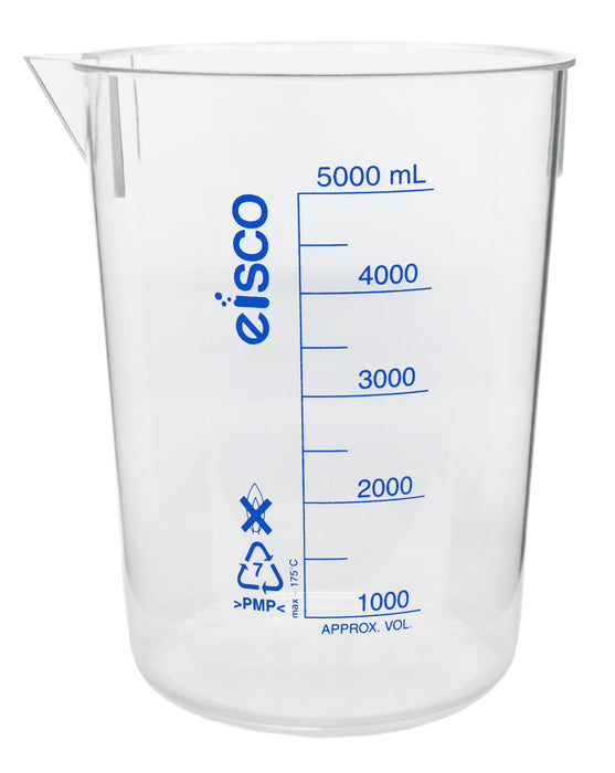 5000ml measuring beaker made of high quality, heavy duty TPX plastic. Short form. Beaker features a non-drip spout. Transparent, with easy to read screen printed graduations and specifications. Autoclavable & microwavable with superior chemical durability.Eisco Labs proudly manufactures its own products using state-of-the-art equipment, and following the highest standards of quality control.Each product is carefully designed by a team of laboratory professionals and experienced engineers with quality and durability in mind. They are manufactured with only the highest grade, raw materials and according to international quality standards to ensure that they can withstand use in even the toughest laboratory environments.