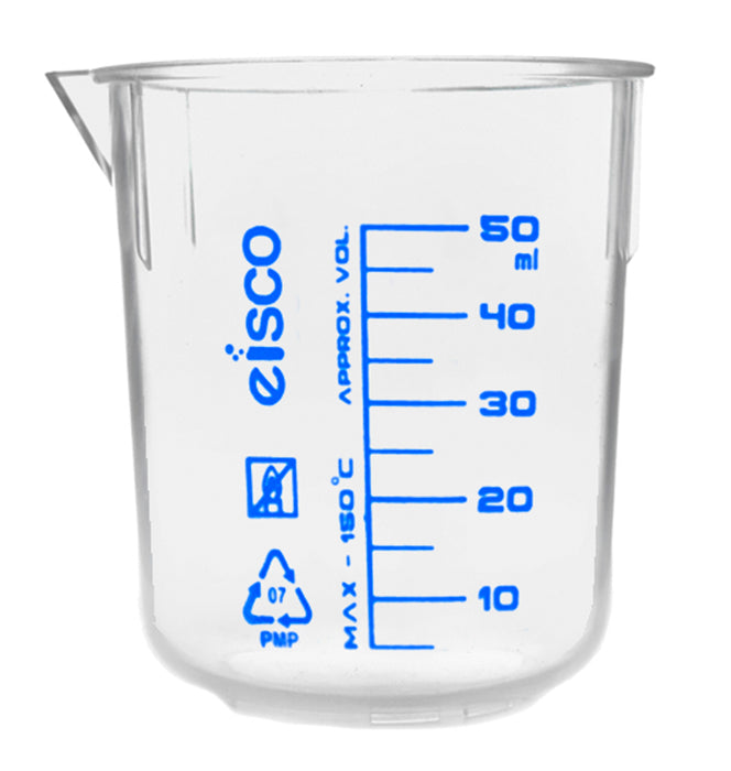 50ml beaker made of high quality, heavy duty TPX plastic. Beaker features a non-drip spout for easy pouring. Excellent optical clarity. Transparent, with easy to read screen printed graduations and specifications. Autoclavable & microwavable with superior chemical durability.Beaker measures 2.5" tall, and has a top diameter measuring 2", and bottom diameter measuring 1.75".Eisco Labs proudly manufactures its own products using state-of-the-art equipment, and following the highest standards of quality control.Each product is carefully designed by a team of laboratory professionals and experienced engineers with quality and durability in mind. They are manufactured with only the highest grade, raw materials and according to international quality standards to ensure that they can withstand use in even the toughest laboratory environments.