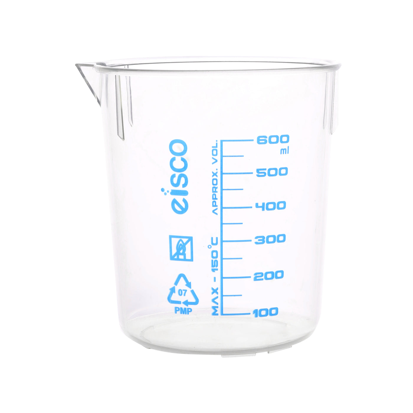 High quality, TPX plastic beaker 600ml capacity Spout for easy pouring. Printed, easy to read, blue graduations, marked every 100ml. 50ml graduation lines 5" tall, 3.5" diameter Designed for use in science laboratories, but can be used in the home as well