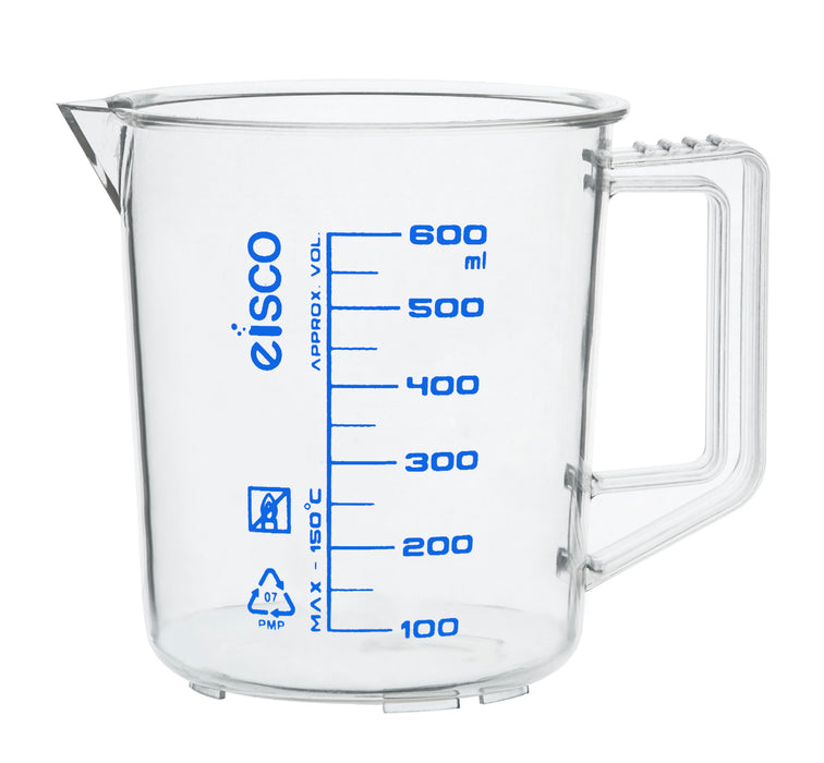 600ml capacity measuring jug, made of with high quality TPX plastic. Jug features excellent optical clarity and easy to read, screen printed graduations. 50ml subdivisions. Features a spout for easy pouring, and handle with thumb grip for stable handling. Jug measures 5" tall, and is 6" wide from spout to handle edge. Bottom diameter measures 3.5".