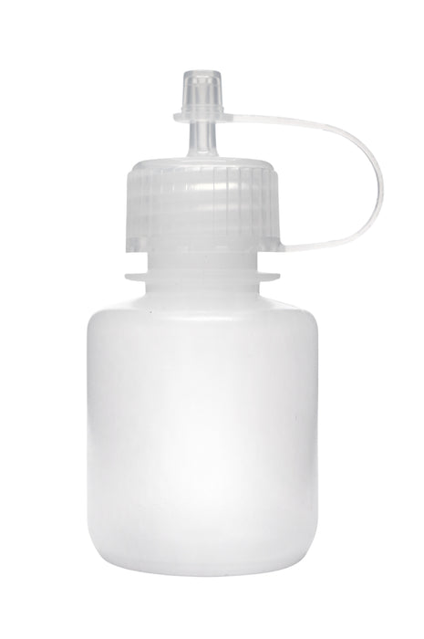 This unique low-density polyethylene dropper bottle comes with a screw cap and a dropper nozzle, allowing for small, uniform drops of liquid to be dispensed. The attached cover prevents spilling. With a capacity of 30ml (1oz), the bottle measures 3 inches tall and 1.4 inches in diameter, made of translucent LDPE plastic.