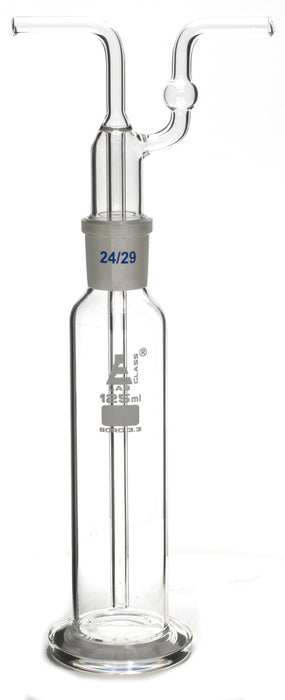125mL tall form borosilicate glass bottle for gas washing with interchangeable joint head (24/29).Eisco Labs Borosilicate glass has the following heat tolerances: Strain Point -515°C | Annealing Point 565°C | Softening Point 820°C.