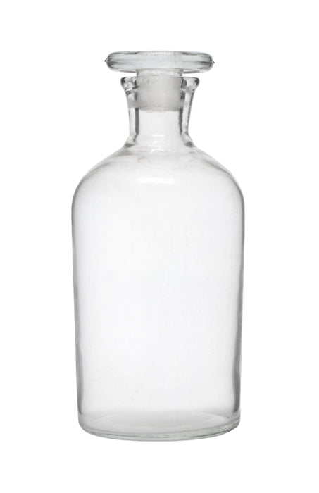 Reagent bottle with 500ml capacity - Intended to contain chemicals in liquid or powder form. Bottle features a narrow neck allowing for easy pouring and decanting. Bottle includes a tight fitting glass stopper. Made of high quality transparent soda glass - Built to last and withstand long time use. Designed for use in professional laboratories, but is an ideal choice for science classrooms and household use. Useful for kitchens, crafting, and for storage. Bottle measures 6.75" tall (7" including lid), and has a body diameter measuring 3.1". Inner diameter of neck measures 20mm.