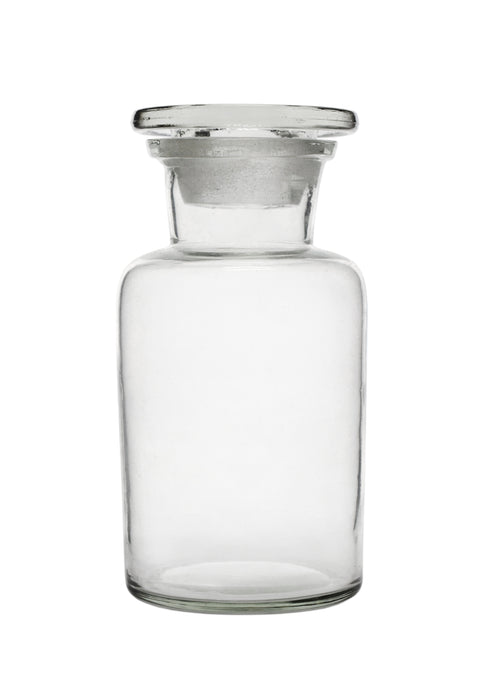 Reagent bottle with 250ml capacity - intended to contain chemicals in liquid or powder form. The bottle features a wide neck, allowing for easy pouring and decanting. It includes a tight-fitting glass stopper. Made of high-quality transparent soda glass, the bottle is built to last and withstand long-term use. Designed for professional laboratories, it's an ideal choice for science classrooms and household use, proving useful in kitchens, crafting, and storage. The bottle measures 4" tall (5.5" including lid) and has a body diameter of 2.75". The inner diameter of the neck measures 40mm.