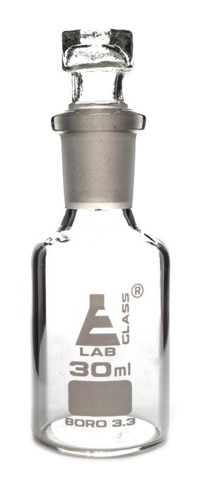 30ml reagent bottle made of high quality borosilicate glass. Narrow mouth with interchangeable hexagonal glass hollow stopper. Socket size 14/23. Designed to be used in labs but is often used in homes or garages as well. This bottle stands 3.75" tall, and is 1.25" in diameter.Eisco Labs Borosilicate glass has the following heat tolerances: Strain Point -515°C | Annealing Point 565°C | Softening Point 820°C.