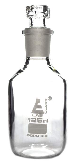 Reagent Bottle made of heavy-duty borosilicate glass with a 125ml capacity and no graduations. The bottle features a narrow mouth with an interchangeable hexagonal hollow stopper, having a socket size of 19/26. Designed for use in science laboratories, it can also be used at home or in garages. This 5.5" tall and 2" diameter bottle is crafted from high-quality borosilicate glass by Eisco Labs, which has the following heat tolerances: Strain Point -515°C, Annealing Point 565°C, and Softening Point 820°C.