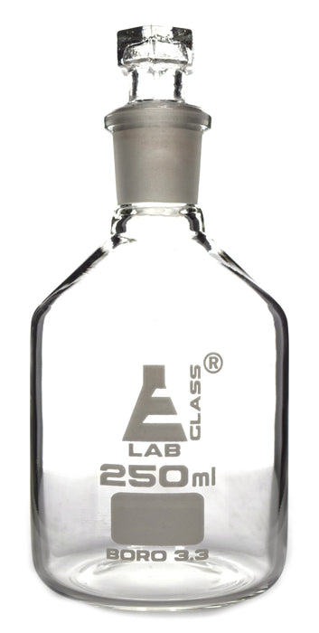 Here is the corrected text: Reagent Bottle made of heavy-duty borosilicate glass with a 250ml capacity, no graduations, and a narrow mouth featuring an interchangeable hexagonal hollow stopper (socket size: 19/26). Designed for use in science laboratories, this bottle can also be used at home. The 250ml reagent bottle is made of high-quality borosilicate glass with a narrow mouth and an interchangeable hexagonal glass hollow stopper (socket size: 19/26). Although designed for laboratory use, it is often used in homes or garages as well. This bottle stands 7 inches tall and is 3 inches in diameter. Eisco Labs Borosilicate glass has the following heat tolerances: strain point -515°C, annealing point 565°C, and softening point 820°C.