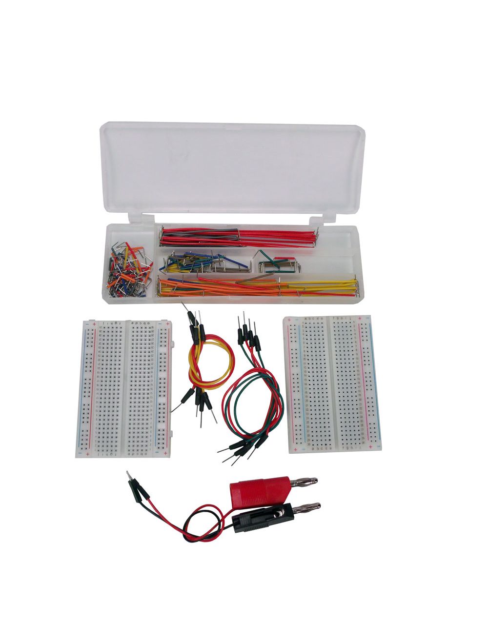 This basic breadboard kit contains all of the basic connecting parts to start exploring circuit design. The kit includes a variety of connecting cord sizes and two breadboards. All that is required is to provide components such as resistors, LEDs, or capacitors. Kit Contents: Solderless Breadboard (30 columns x 5 rows x 2), 2 Long connecting wire, 6â€, 4 Long connecting wire, 8â€, 4 Long connecting wires 6†with banana plugs, 2 Set of 130 connecting wires (10 each of 13 sizes) in case. Sizes included are: 3 mm, 5 mm, 7 mm, 9mm, 11 mm, 13.5 mm, 15 mm, 20 mm, 25 mm, 50 mm, 75 mm, 100 mm, 125 mm
