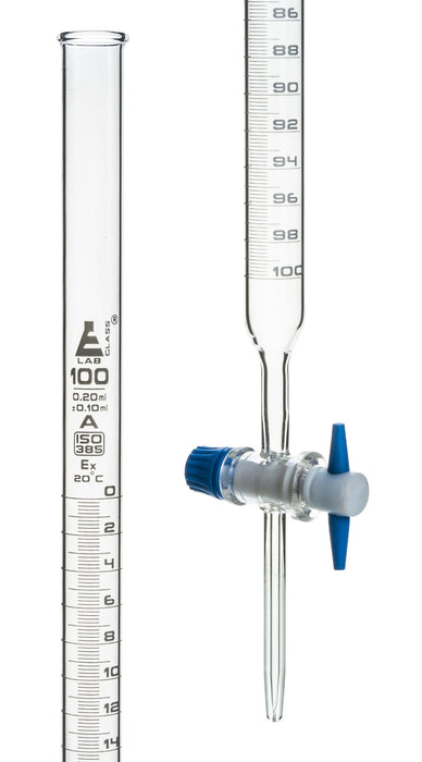 ull; PTFE Stopcock • Class A precision • 100mL Capacity, 0.2mL Graduations Includes: (1) Burette Borosilicate Burette w/ PTFE Stopcock - 100mL cap., 0.2mL grad, Class A (1) Burette These are high quality burettes are perfect for every day, high precision lab work. Borosilicate glass with PTFE key stopcock.
