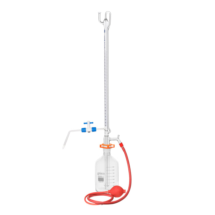 Automatic zero burette with 25ml capacity mounted on a 1000ml reservoir. Includes automatic zero facility. Class A with 29/32 joint size, 0.05±ml tolerance and 0.10ml sub. divisions. Accurate as per ISO 385.Unique features of Schellbach auto zero burettes include a vertical white stripe with central blue ribbon to facilitate accurate reading of the meniscus and an intermediate PTFE stopcock which facilitates the complete drainage of excess liquid back into the reservoir. Both burette and reservoir are made of precisely bore high quality Borosilicate 3.3 glass. Built to last. Features chemical resistant blue printing. Individually calibrated to deliver (TD) precise volume. With custom foam packaging for safe transport and storage. All contents are included in a single package.Eisco Labs proudly manufactures its own products using state-of-the-art equipment, and following the highest standards of quality control.Each product is carefully designed by a team of laboratory professionals and experienced engineers with quality and durability in mind. They are manufactured with only the highest grade, raw materials and according to international quality standards to ensure that they can withstand use in even the toughest laboratory environments.