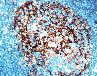 CD23, B Cell^ Clone number 1B12, This antibody is specific to a membrane glycoprotein of 45 KD, designated as CD23. CD23 is found on a subpopulation of peripheral blood cells, B lymphocytes and on EBV transformed B lymphoblastoid cell lines.