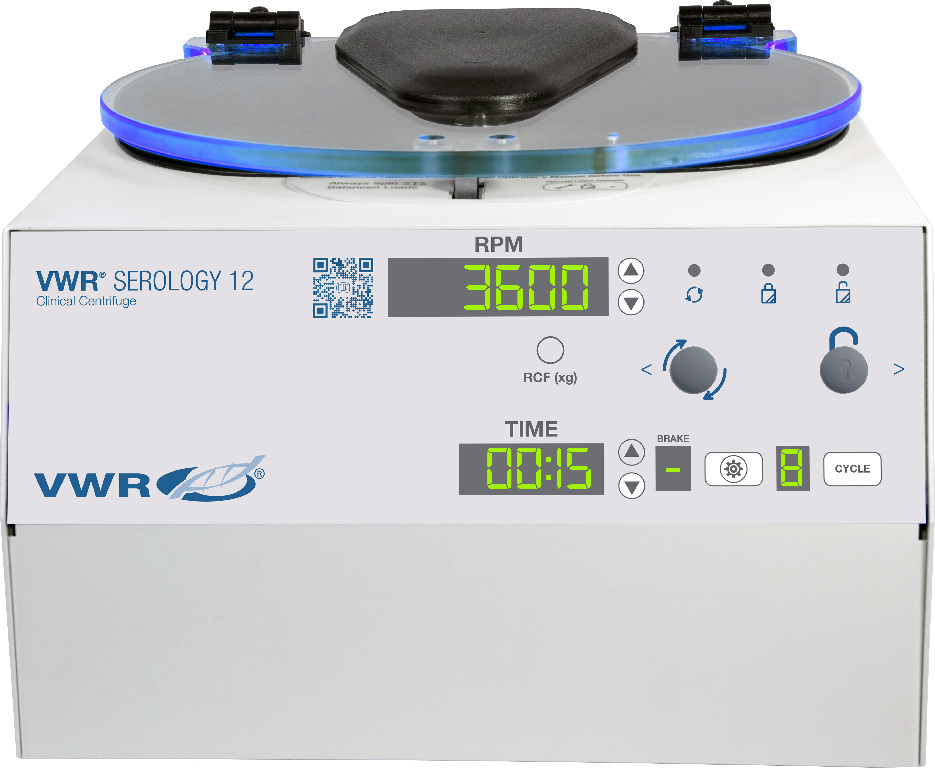 The only drop-in replacement for a best selling blood banking centrifuge. Perfect for all blood typing and cross-matching activities, the serology 12 integrates into any laboratory with minimal process changes., The VWR® serology 12 clinical centrifuge is specifically designed to facilitate high-quality blood grouping, typing, cross matching and other cell-washing procedures for a wide range of tube sizes. Based on a popular blood banking centrifuge and using the same rotors, the serology 12 ensures samples are efficiently processed, with no individual handling necessary., 02_BulletPoint: View time remaining and set cycle parameters using the digital display | Store up to 10 custom time, speed, acceleration and braking settings | Max speed 1040×g/3550 rpm | Spin up to 6 capped and 12 uncapped 13×75 mm tubes with minimal handling | Tube positions are numbered for quick identification | Compatible with existing SeroFuge rotors | 2 year warranty, 08_Certifications: CE, MET, UKCA., 11_Delivery: Supplied with 12 tube rotor and tube holders., Capacity: 12× 75 mm uncapped tubes or 6× 100 mm tubes with additional rotor, Model: Serology 12 clinical centrifuge, Rotor type: Fixed angle, Timer: Digital, Cat. No.: 77392-164, W×D×H: 33×38×23 cm (13×15×9"), Electrical: 100 - 240 VAC, 50/60 Hz, Max. speed: 3600 rpm, Max. rcf: 1040×g, Weight: 12.3 kg (27 lbs.), Final SAP Desc Link: 4633299, SAP Description Status: Ready, The only drop-in replacement for a best selling blood banking centrifuge. Perfect for all blood typing and cross-matching activities, the serology 12 integrates into any laboratory with minimal process changes., The VWR® serology 12 clinical centrifuge is specifically designed to facilitate high-quality blood grouping, typing, cross matching and other cell-washing procedures for a wide range of tube sizes. Based on a popular blood banking centrifuge and using the same rotors, the serology 12 ensures samples are efficiently processed, with no individual handling necessary., 02_BulletPoint: View time remaining and set cycle parameters using the digital display | Store up to 10 custom time, speed, acceleration and braking settings | Max speed 1040×g/3550 rpm | Spin up to 6 capped and 12 uncapped 13×75 mm tubes with minimal handling | Tube positions are numbered for quick identification | Compatible with existing SeroFuge rotors | 2 year warranty, 08_Certifications: CE, MET, UKCA., 11_Delivery: Supplied with 12 tube rotor and tube holders., Final SAP Desc Link: 4633299, SAP Description Status: Ready
