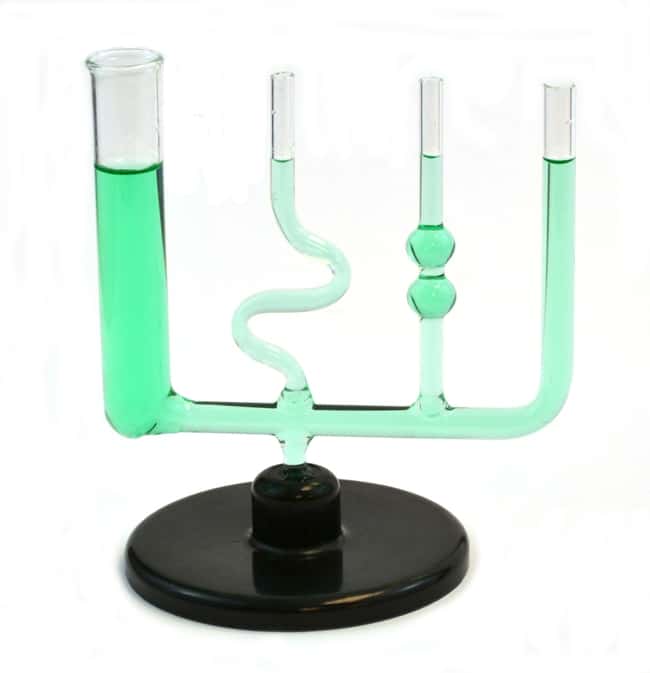This glass equilibrium tube set includes 4 borosilicate glass tubes of different shapes to illustrate that liquids will maintain the same level, regardless of shape