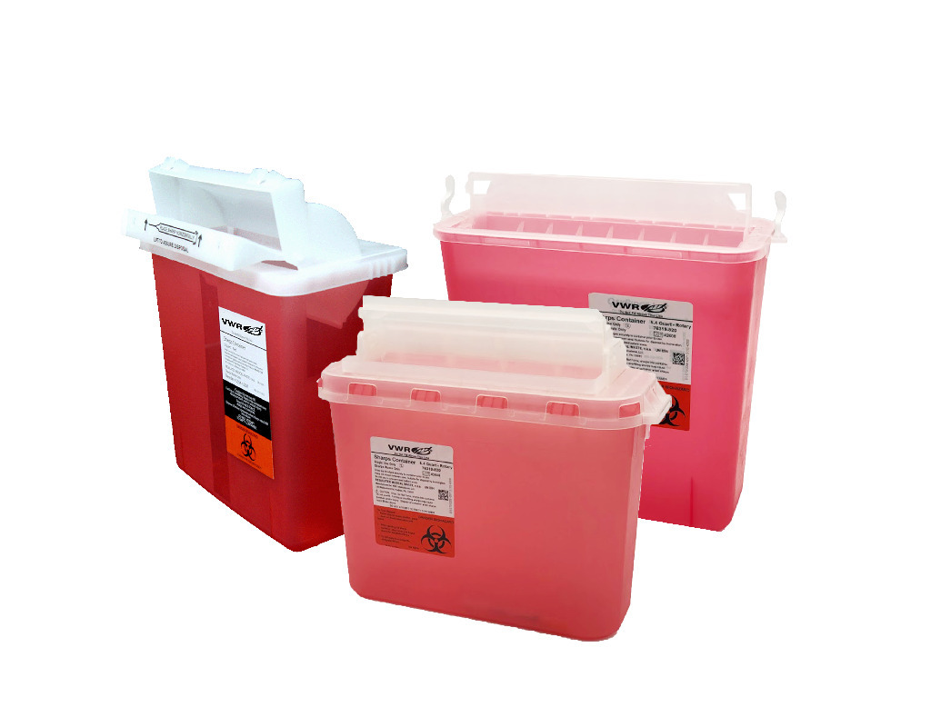 Here is the corrected text: These containers provide safe disposal of sharps and biohazard waste. The sliding lid design is perfect for busy professional settings such as laboratories, hospitals, dental offices, and physician offices that require one-handed access to open sharps containers. Choose from three sharps containers with tortuous path lid designs. They are lightweight and transportable, making them ideal for professionals who need an easy yet safe way to dispose of biohazardous waste. A quick-access rotating door on the lid allows users to drop in waste and move the lid to a 'temporary close' position for storage between uses. These containers are safe to autoclave or incinerate. • Tortuous path containers are intended for use in patient rooms or unsupervised areas, designed to prevent untrained hands from making contact with contents. • They are wall-mountable and stackable, designed for high-activity environments. • The translucent colors feature lead-free pigments containing no heavy metals. • The containers are constructed of puncture- and impact-resistant material and are safe to autoclave or incinerate. Certifications: Meets or exceeds FDA standards, including OSHA and EPA requirements for local biohazard waste collection. Available options: * 5.4 qt., Red, Horizontal Rotating Opening, Cat. No.: 76319-820, L×W×H: 12×4.8×12" * 5 qt., Red, Horizontal Drop Opening, Cat. No.: 76319-822, L×W×H: 10×4.3×11.5" * 5 qt., Red, Mailbox Opening, Cat. No.: 76319-824, L×W×H: 10×4.3×11.5"
