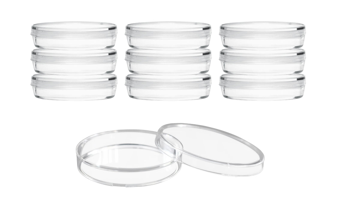 Pack of 10 disposable petri dishes made of high quality, transparent polystyrene plastic. Sterile. Triple vented lid to allow for airflow and discourage condensation build-up. Ideal for applications requiring better gaseous exchange or evaporation. Petri dish is packed individually in polyethylene bags and sterilized by radiation. Non-toxic, multifunctional and ready to use. Excellent for general laboratory applications, including cell culturing, plant germination, precipitate drying and solvent evaporation, home or classroom science experiments, crafting, small storage solutions and more.Dish measures 60mm (2.4") in diameter and 15mm (0.6") deep.