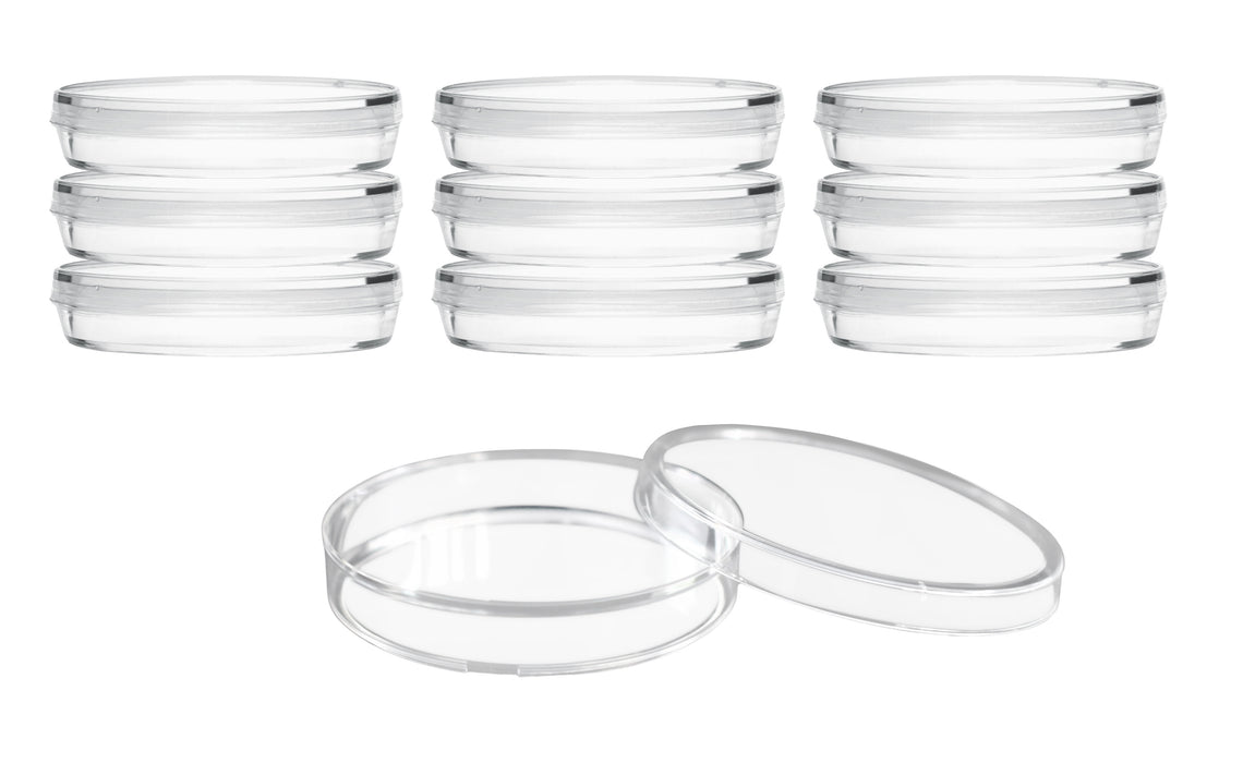 Pack of 10 disposable petri dishes made of high quality, transparent polystyrene plastic. Sterile. Triple vented lid to allow for airflow and discourage condensation build-up. Ideal for applications requiring better gaseous exchange or evaporation. Petri dish is packed individually in polyethylene bags and sterilized by radiation. Non-toxic, multifunctional and ready to use. Excellent for general laboratory applications, including cell culturing, plant germination, precipitate drying and solvent evaporation, home or classroom science experiments, crafting, small storage solutions and more.Dish measures 90mm (3.5") in diameter and 14mm (0.5") deep.