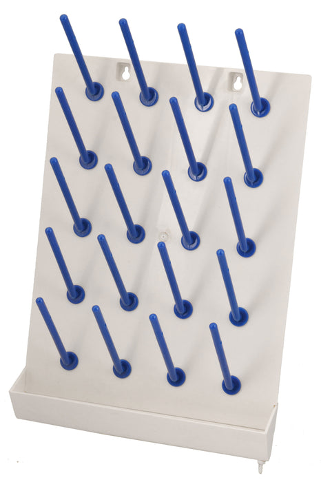 ull; Excellent option for post wash draining of tubes & bottles in the laboratory • Each peg is 14 cm in length and can be added or removed as needed. Simply insert the peg into one of the 20 holes tighten down with the included screw nut. Pegs placements are 6.5 cm apart. • Draining rack comes with a collection tray at the bottom. The collection tray has an extension for accepting a drain tube (5 mm ID) so that the waste fluid can be collected in a container. • Rack Dimension: 20.25x13.8x2.5 inches • Wall mounting accessories and drain tube are not included.