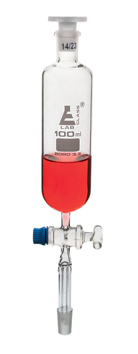 Cylindrical dropping funnel made of high-quality, heavy-duty 3.3 borosilicate glass with a 100mL capacity and no graduations. It features a glass key stopcock, a stem with a 14/23 cone, and is fitted with an interchangeable 14/23 plastic stopper. The funnel measures 10.5 inches in height and 1.75 inches in width. Autoclavable and offering superior chemical durability, it can withstand high temperatures and thermal shocks due to its low temperature gradient. Eisco Labs' borosilicate glass has the following heat tolerances: strain point, 515°C; annealing point, 565°C; and softening point, 820°C.