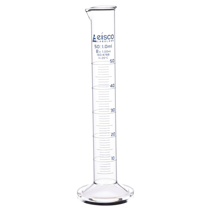 Here is the corrected text: This 50ml graduated measuring cylinder is made of high-quality, heavy-duty Borosilicate 3.3 glass. It features a spout for easy pouring and a round base for extra stability. With a Class B tolerance of ±1.00ml as per DIN EN ISO 4788 standard, it boasts blue-printed graduations and specifications with 1ml subdivisions. The cylinder stands 7.5" tall, with a base measuring 2" wide. The inner diameter of the cylinder body measures 22mm (0.8"), and the outer diameter measures 27mm (1"). Autoclavable, it offers superior chemical durability and can withstand high temperatures and thermal shocks due to its low temperature gradient. Eisco Labs Borosilicate glass has the following heat tolerances: strain point -515°C, annealing point 565°C, and softening point 820°C. It is calibrated to contain.