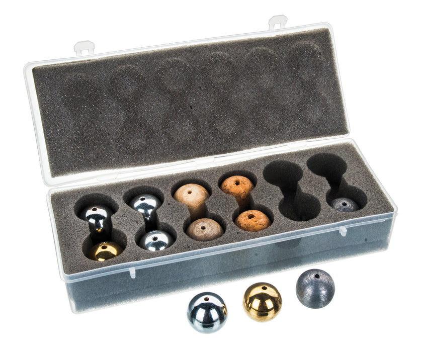 This set includes two drilled balls made from each of the following materials: aluminum, brass, cork, lead, steel, and wood. They are perfect for pendulum experiments and can be used to fulfill a variety of laboratory needs.