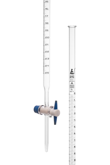 • Class A tolerance • The 25mL capacity burette includes: (1) Burette These high-quality borosilicate burettes feature a straight bore and interchangeable PTFE key stopcocks, ensuring accuracy as per DIN ISO 385 and ASTM-E287 standards. The graduations are in blue color, with a capacity of 25ml, subdivided into 0.10ml increments, and a tolerance of ± 0.05ml.